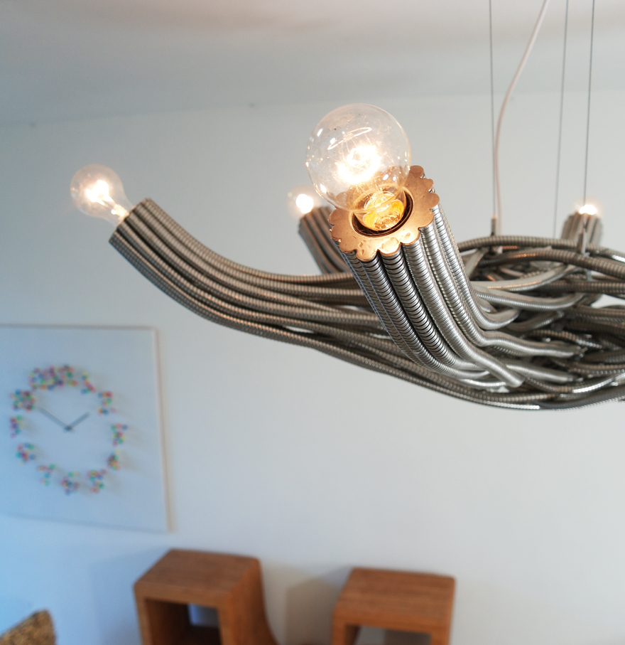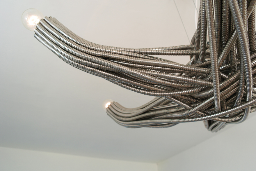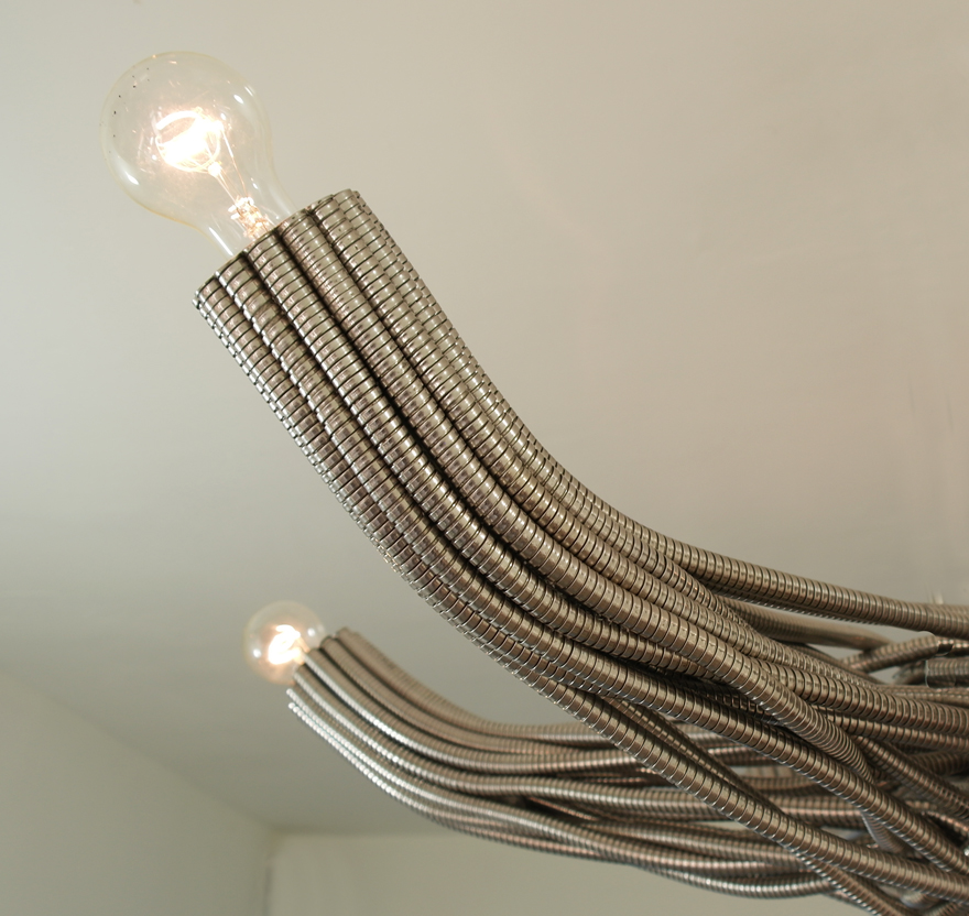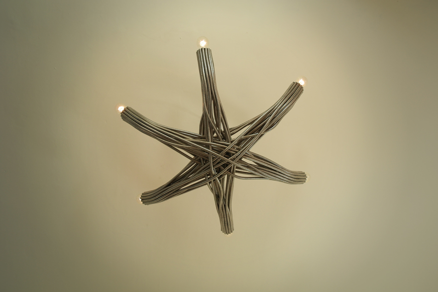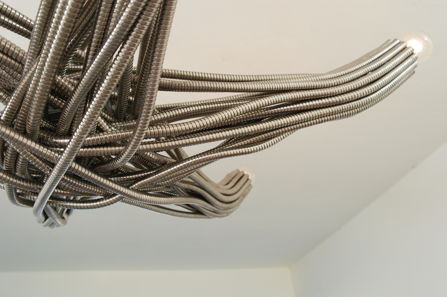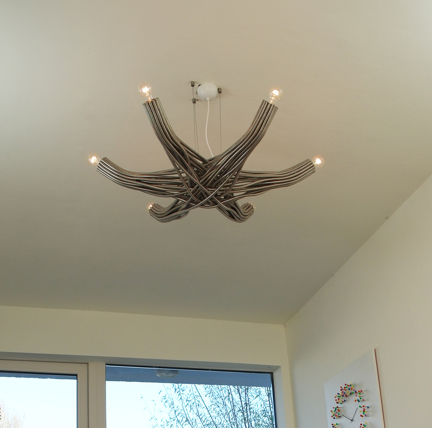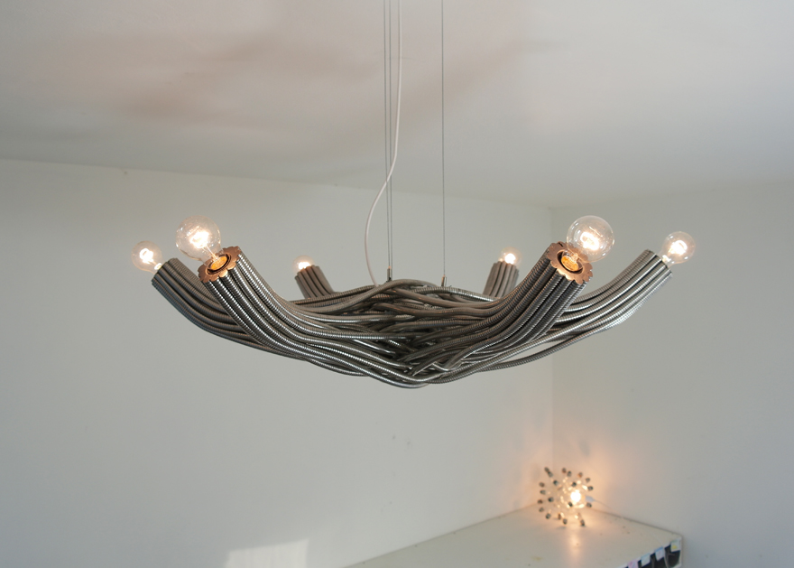 The center of the chandelier is an intersection made of chaos: Steel tubes organically flow under and over each other, trying to find a way out. The tubes continue to flow, and meander into 6 straight geometric arms. The arms hold 6 light bulbs