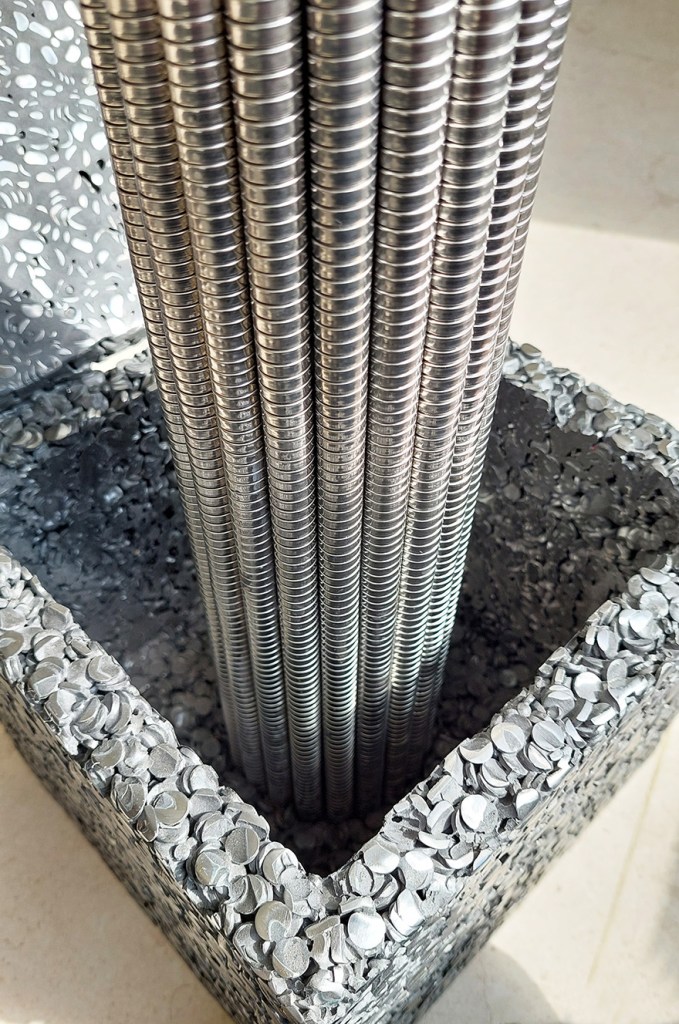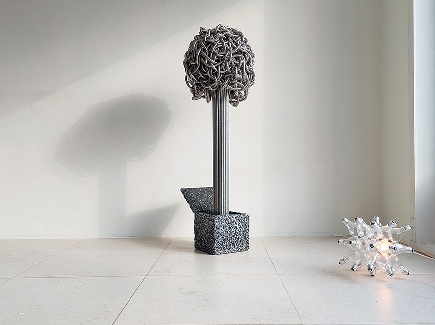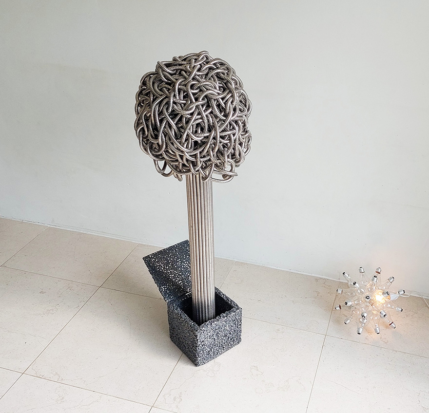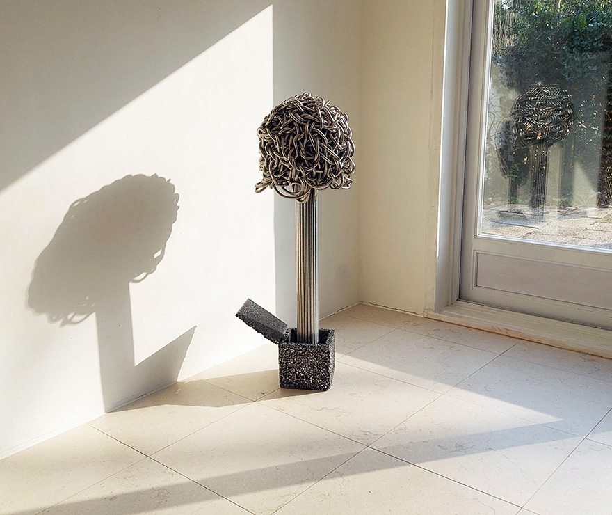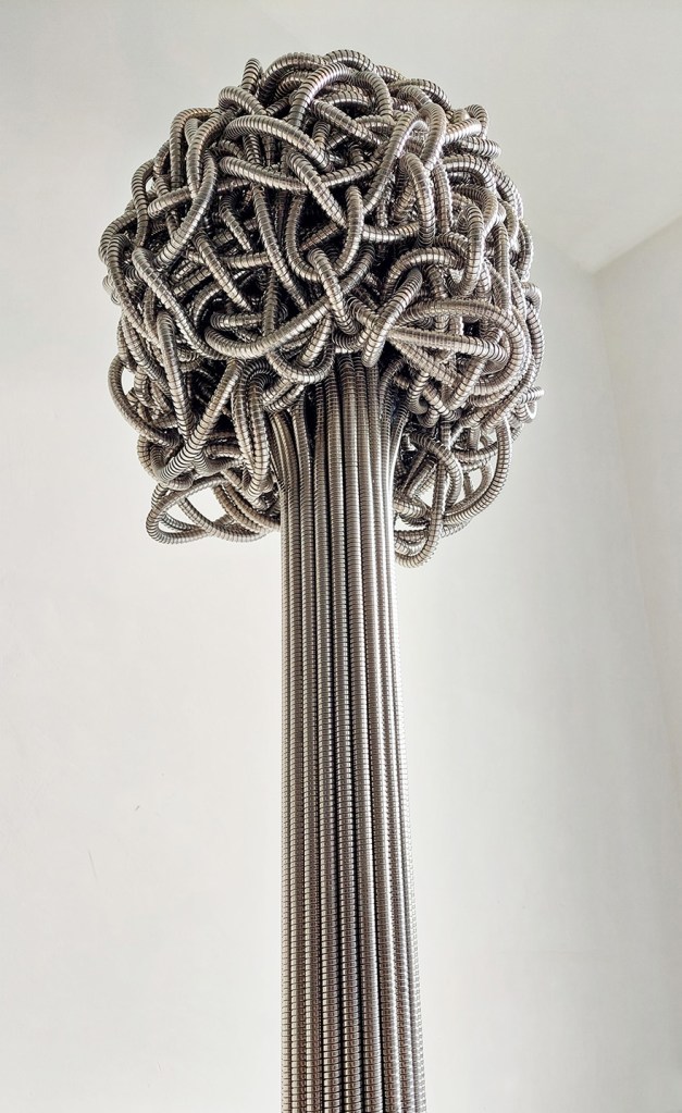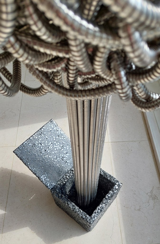 Flexible steel tubes are shaped by hand ,and mounted onto a base structure.