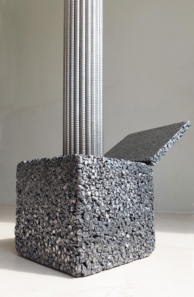 The base is shaped like a box. The lit seems to be forced open by steel chaos, organically flowing, wriggling, and coiling to freedom.