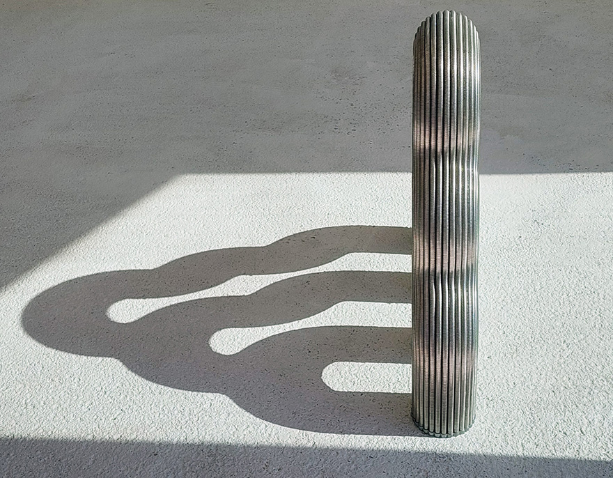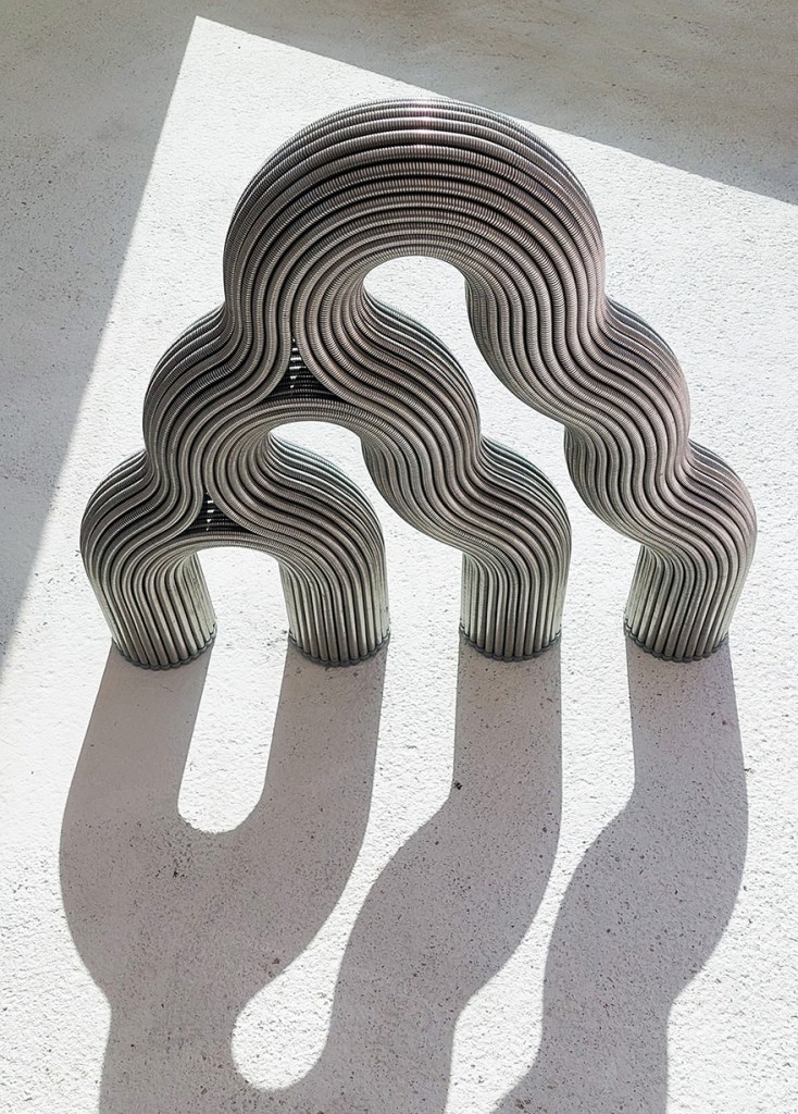 Flexible steel tubes are shaped by hand ,and mounted onto a base structure.