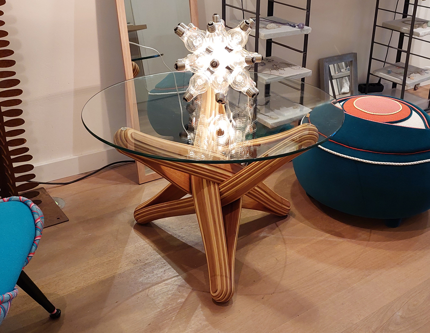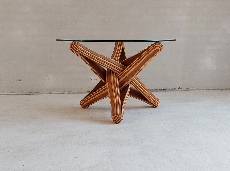 End result is a mix of nature and mathematics, of possible and impossible. A strong dynamic shape that looks different watched from different viewing points. A contemporary coffee table design and a mid-century homage.