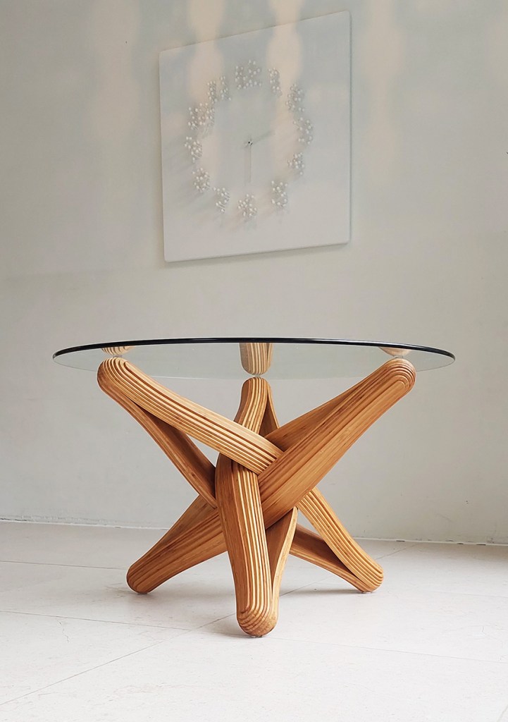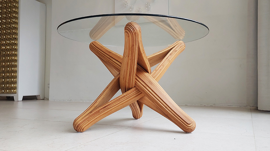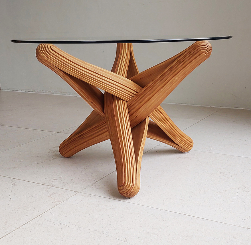 End result is a mix of nature and mathematics, of possible and impossible. A strong dynamic shape that looks different watched from different viewing points. A contemporary coffee table design and a mid-century homage.
