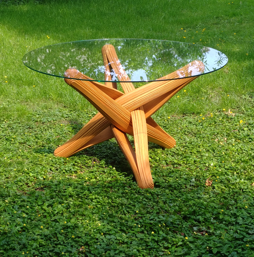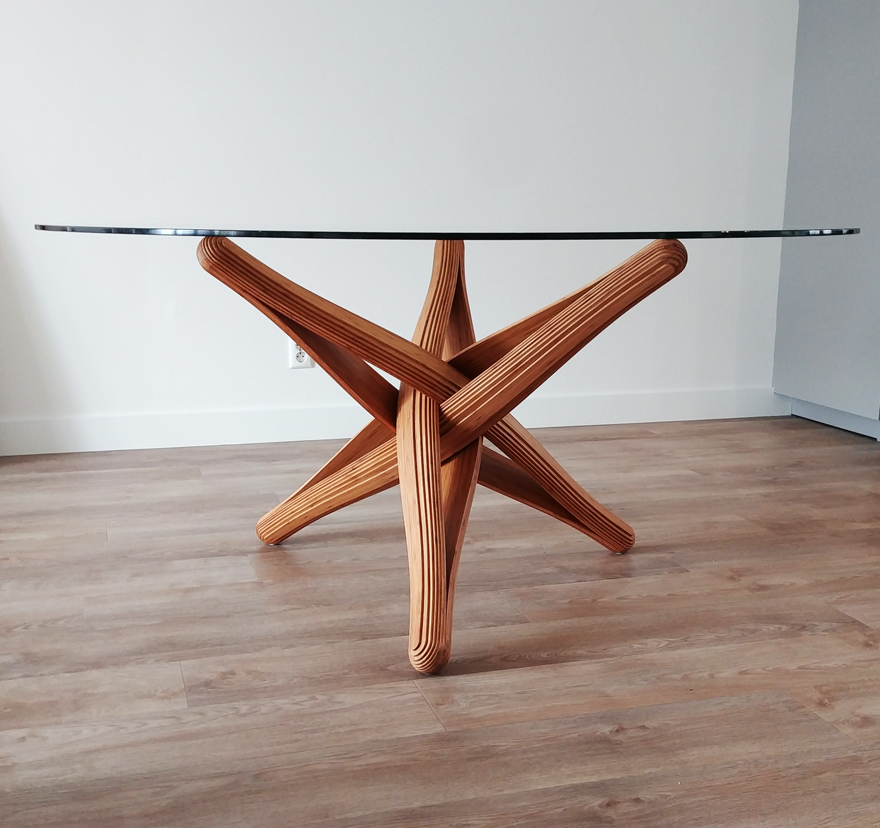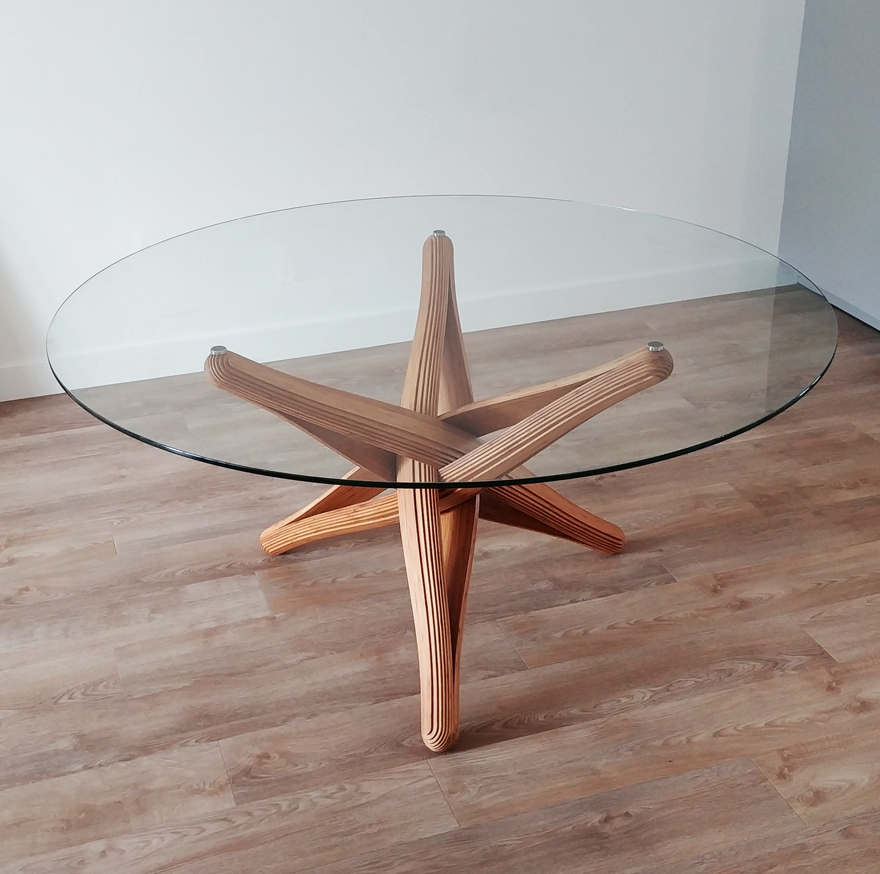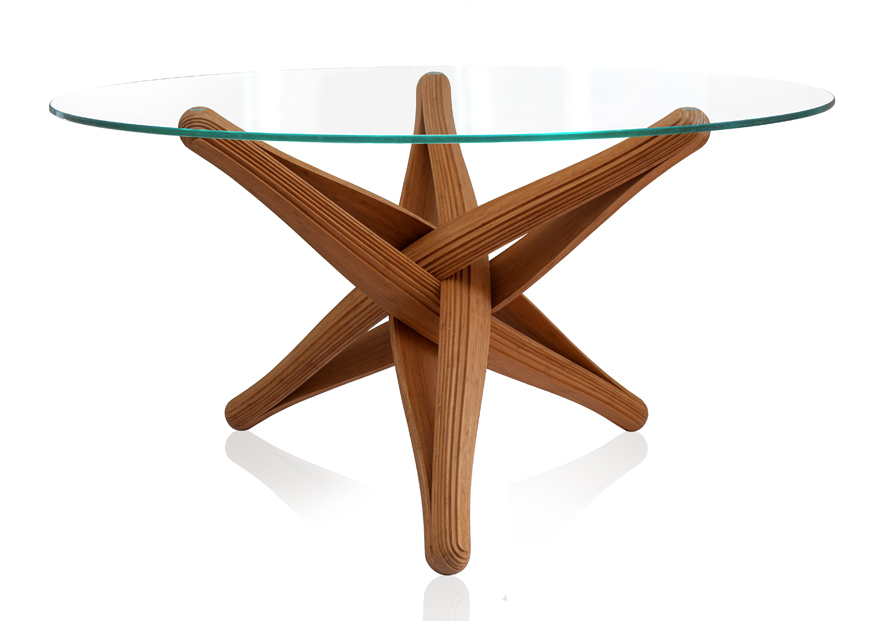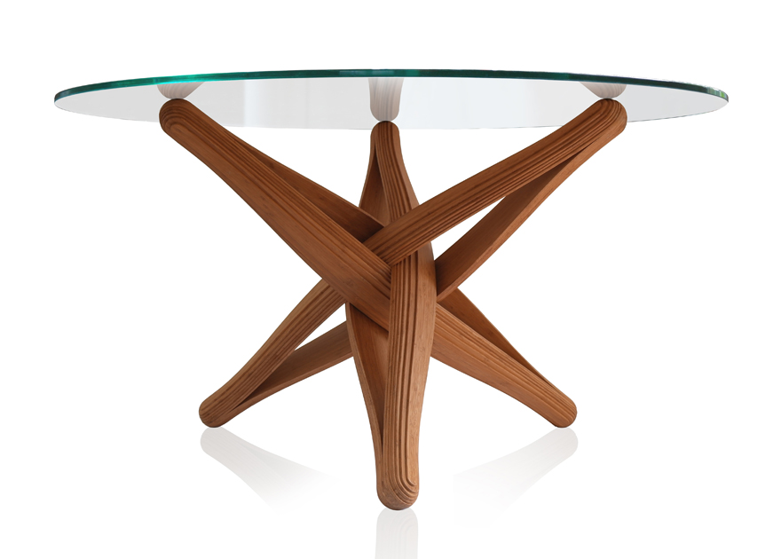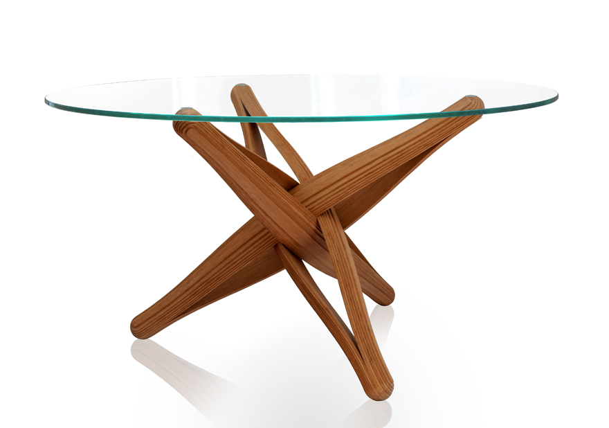 End result is a mix of nature and mathematics, of possible and impossible. A strong dynamic shape that looks different watched from different viewing points. A contemporary dining table design and a mid-century homage.