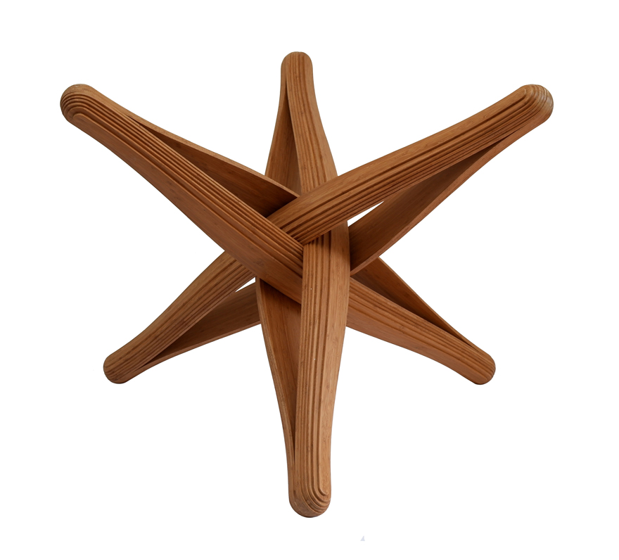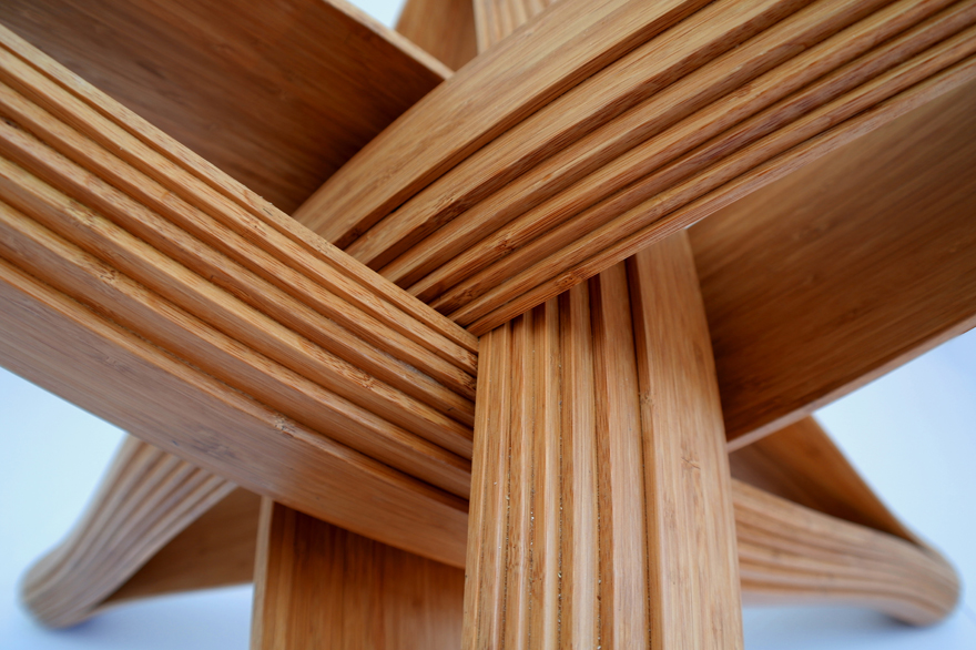 “LOCK” dining table is designed out of the qualities, possibilities and characteristics of its material: bamboo. The frame is build up from pressed layers of flexible bamboo. The shape is formed by the bamboo’s natural bending curve. The layers of bamboo curve through each other and entwine, locking each other in place. This “layer cake”enhances the curves ,flow and shape of the table.